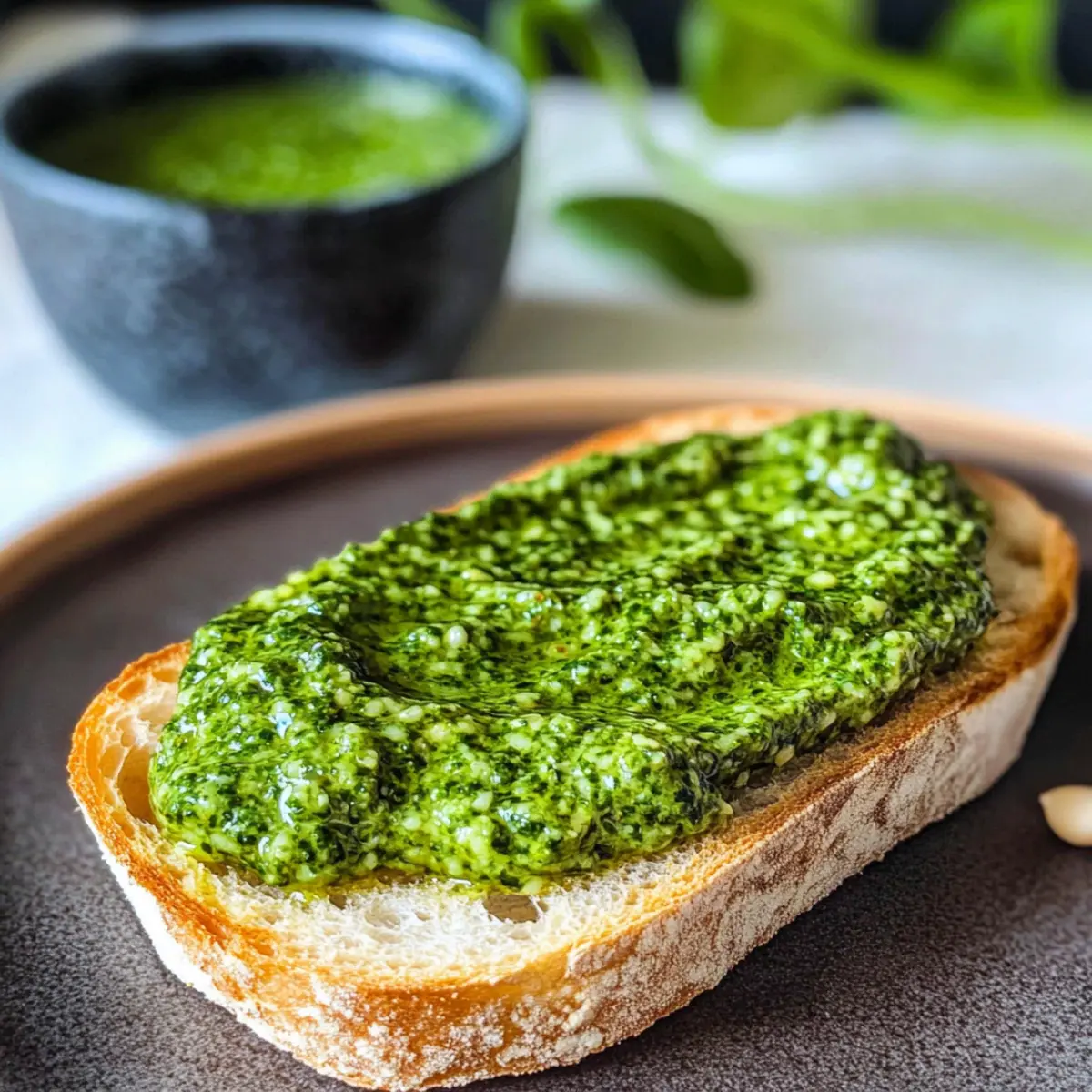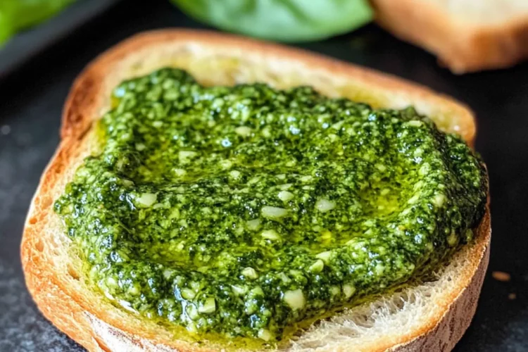 Die Kombination aus frischem Baguette und Bärlauchpesto ist unwiderstehlich. Der knusprige Außenbereich sorgt für einen hervorragenden Kontrast zur samtigen Pesto-Textur.