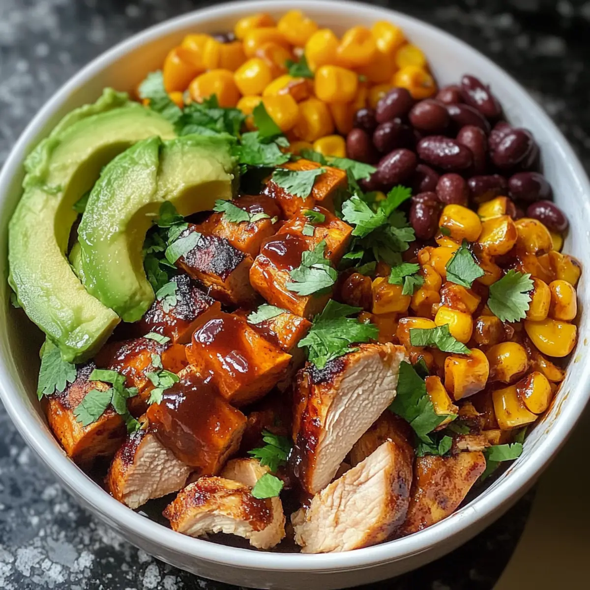 Hinweis: Bereite dich auf eine Geschmacksexplosion vor mit dieser bunten und nährstoffreichen BBQ-Hühnchen Süßkartoffel-Schüssel!