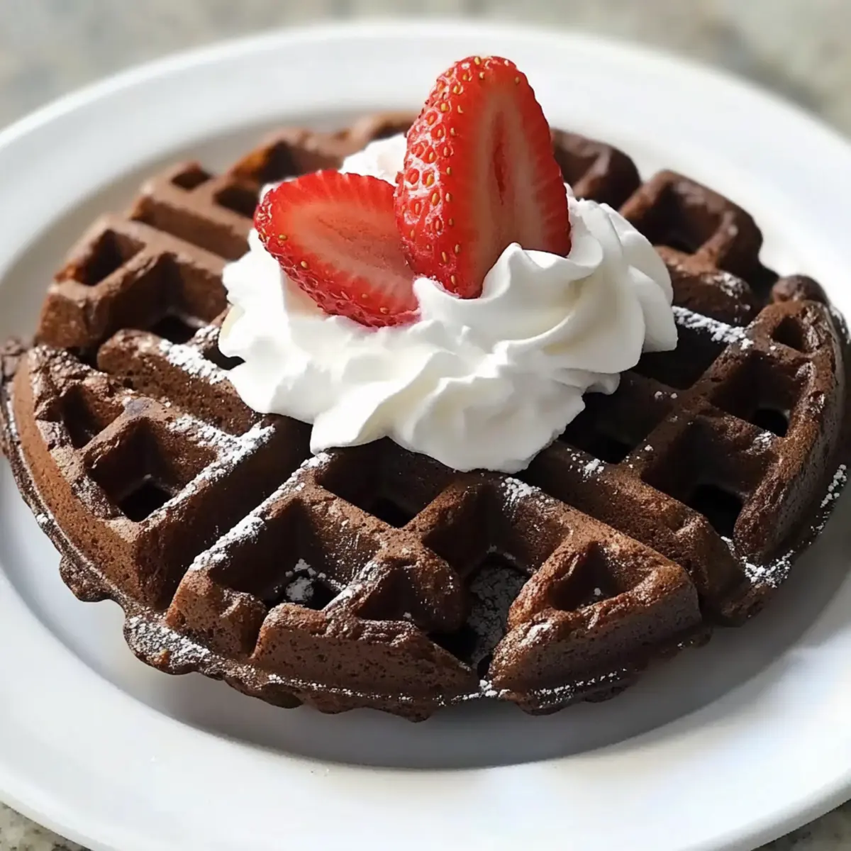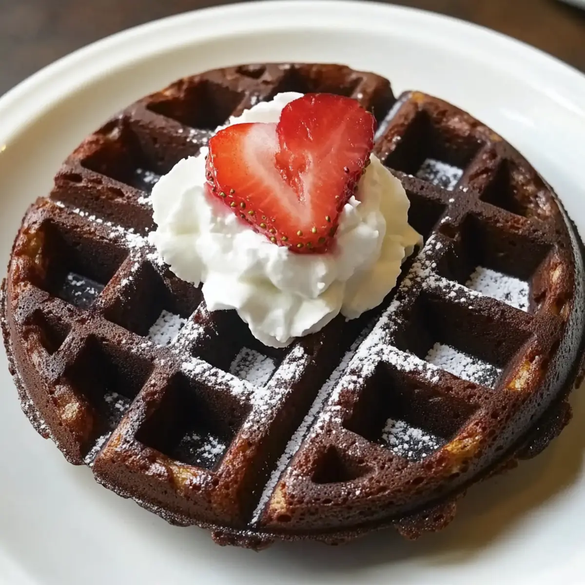 Serviere die warmen Brownie-Teig Waffeln sofort, garniert mit frischen Erdbeeren, Schlagsahne oder Nüssen nach Wahl. Diese Waffeln sind nicht nur köstlich, sondern auch das perfekte Highlight für dein Frühstück oder Dessert.