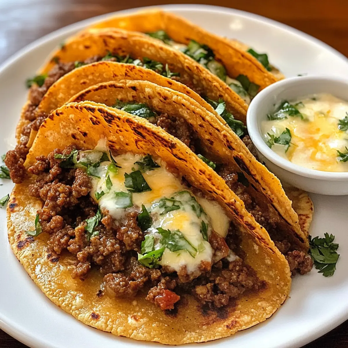 Lege die frisch frittierten Tacos auf ein Kühlregal, um überschüssiges Öl abtropfen zu lassen. Garniere sie optional mit frischem Koriander, um eine lebendige Farbe und Frische hinzuzufügen. Serviere die knusprigen Rinderhackfleisch Tacos sofort mit einer Sauce deiner Wahl für ein unvergessliches Geschmackserlebnis.