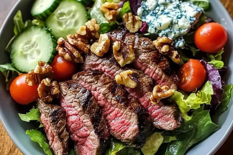 Dekoriert euren Salat mit 0,5 Tasse zerbröseltem Blauschimmelkäse und 0,25 Tasse gerösteten Walnüssen. Gebt das vorbereitete Dressing kurz vor dem Servieren über den Salat, um ihn frisch und knackig zu halten. Der Einfache gegrillte Steak-Salat ist nun bereit, genossen zu werden!