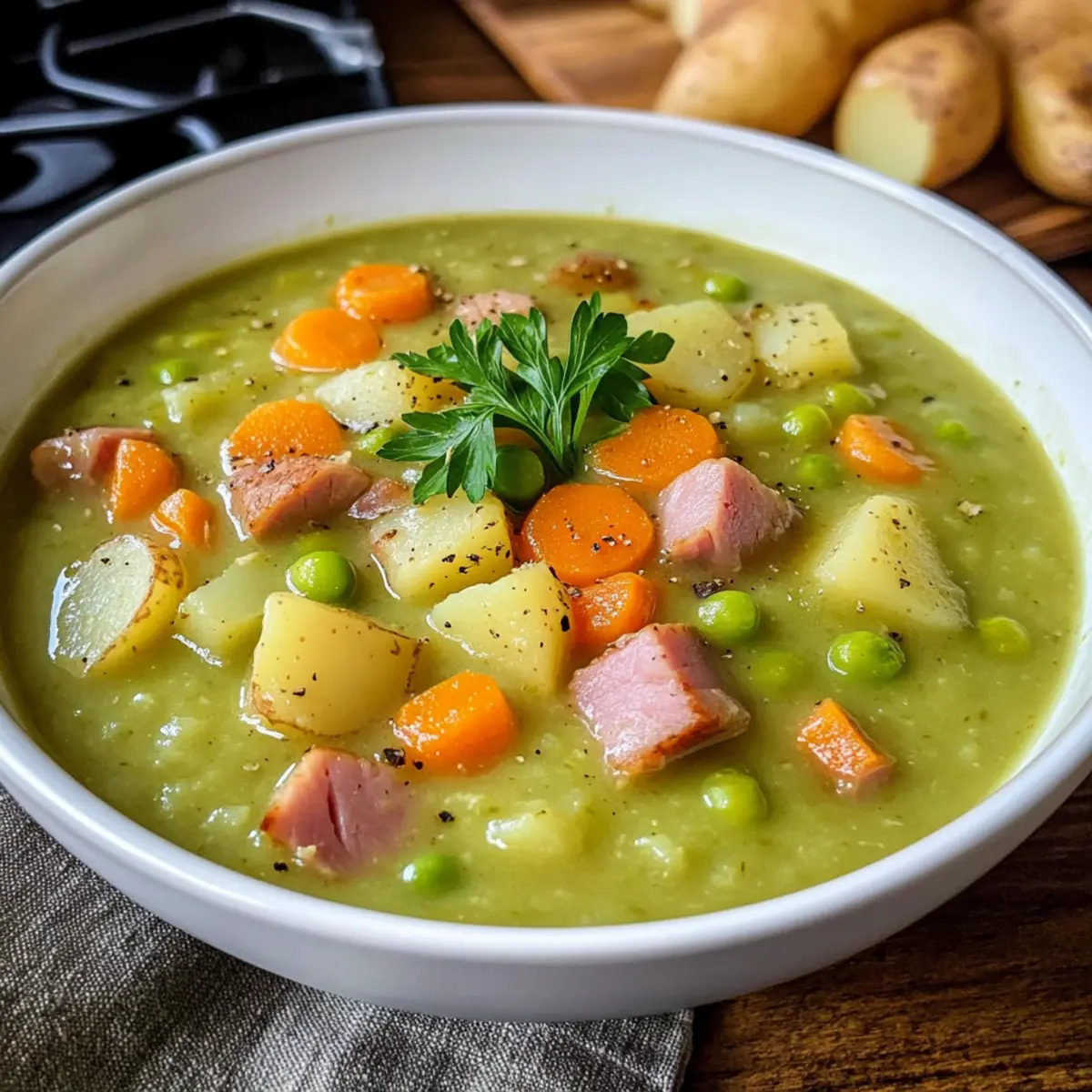 Genieße die Erbsensuppe und entdecke, wie das Zusammenspiel der Zutaten nicht nur dein Mittagessen bereichert, sondern eine schöne Tradition auf den Tisch bringt!