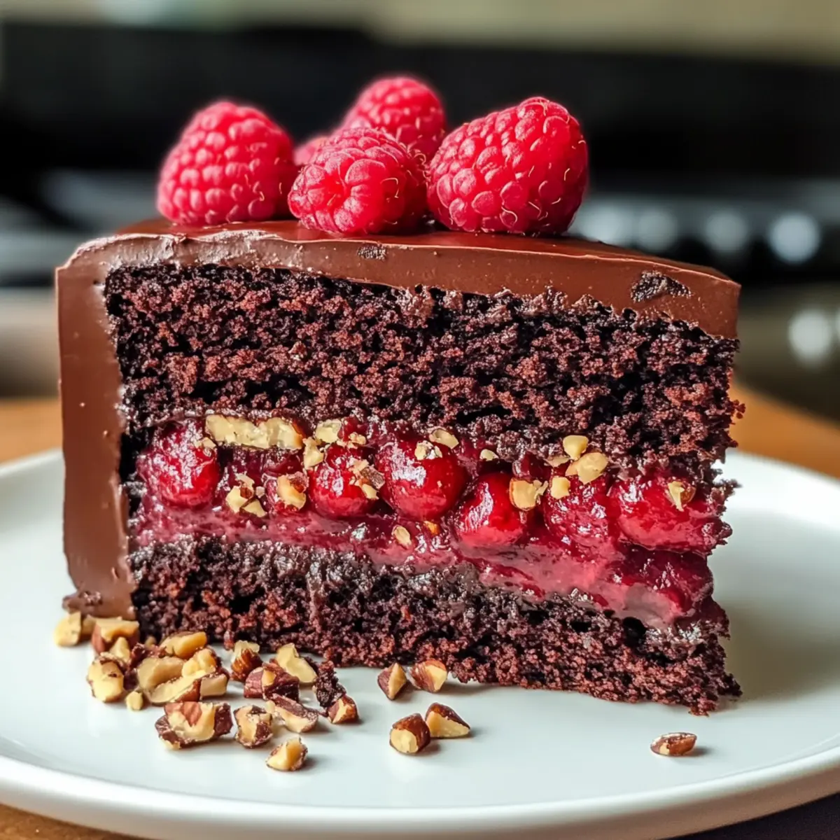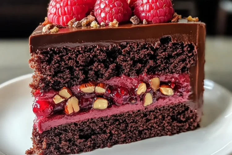 Extra feuchter Schokoladenkuchen mit Himbeeren und Haselnüssen