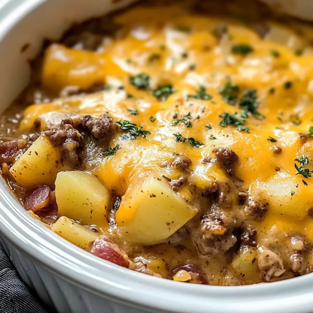 Kurz vor dem Servieren rühren Sie die Mischung im Slow Cooker sanft um, um sicherzustellen, dass alle Zutaten gut vermischt sind. Streuen Sie großzügig den scharfen Cheddar Käse oben auf den Auflauf und lassen Sie ihn schmelzen, bevor Sie servieren. Genießen Sie Ihren herzhaften Holzfällerauflauf, während er warm auf den Tellern ist!