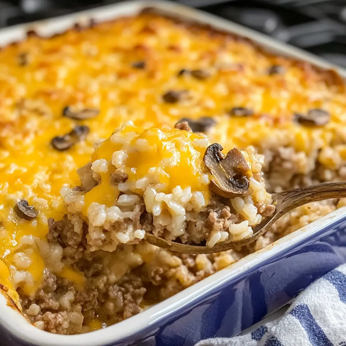 - Das vorgebratene Hackfleisch, die Pilzrahmsuppe, die Milch, den Sauerrahm und die Hälfte des Cheddar-Käses unter den Reis und die Pilze mischen. Alles gut verrühren, bis eine cremige Mischung entsteht.