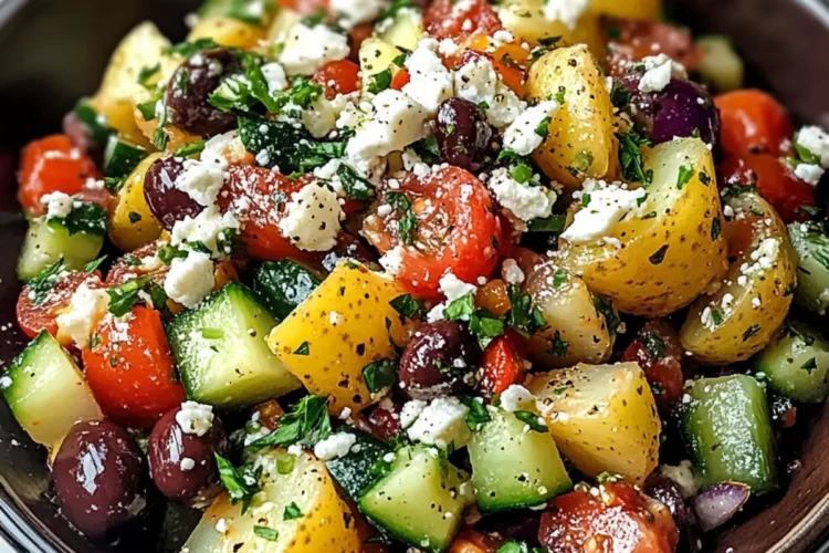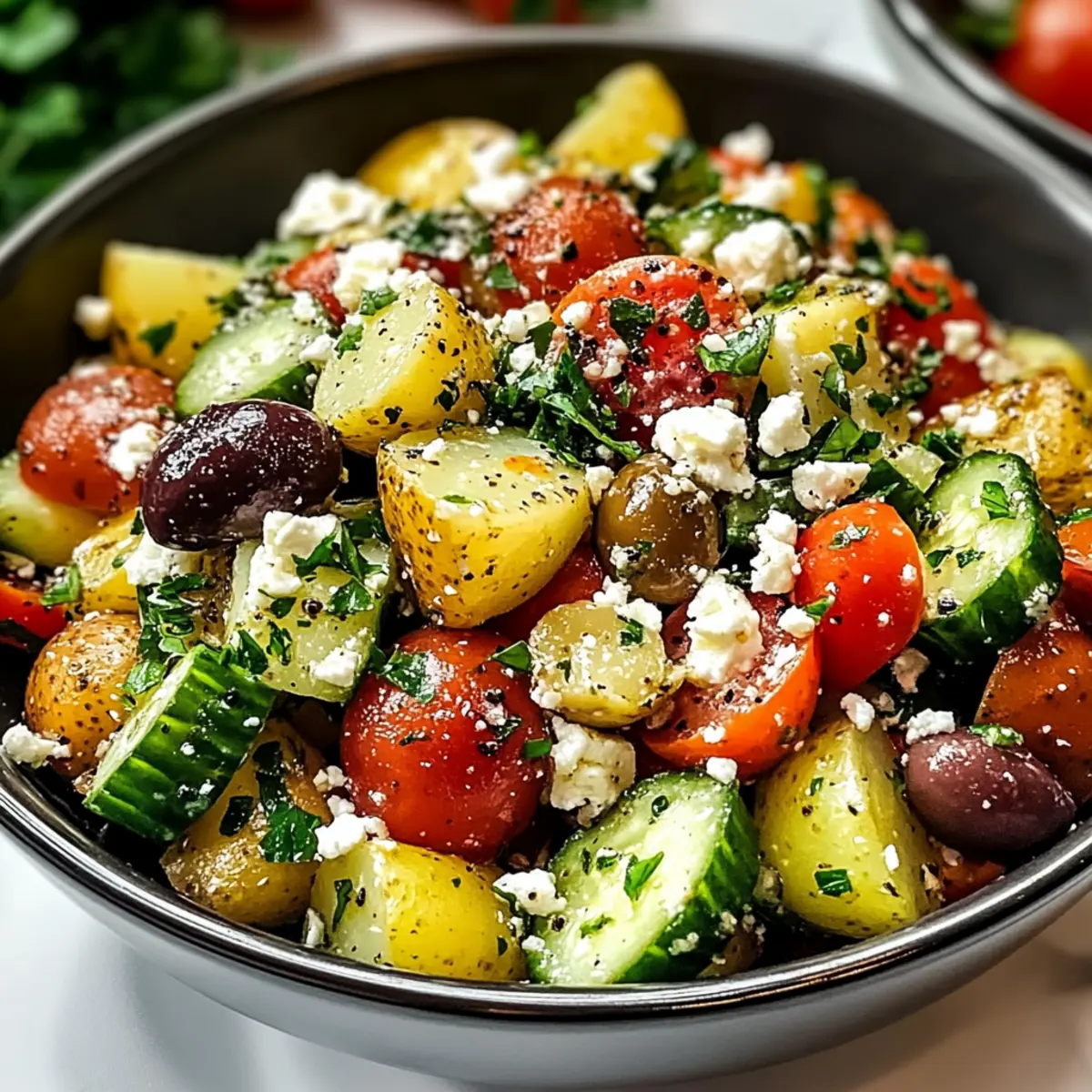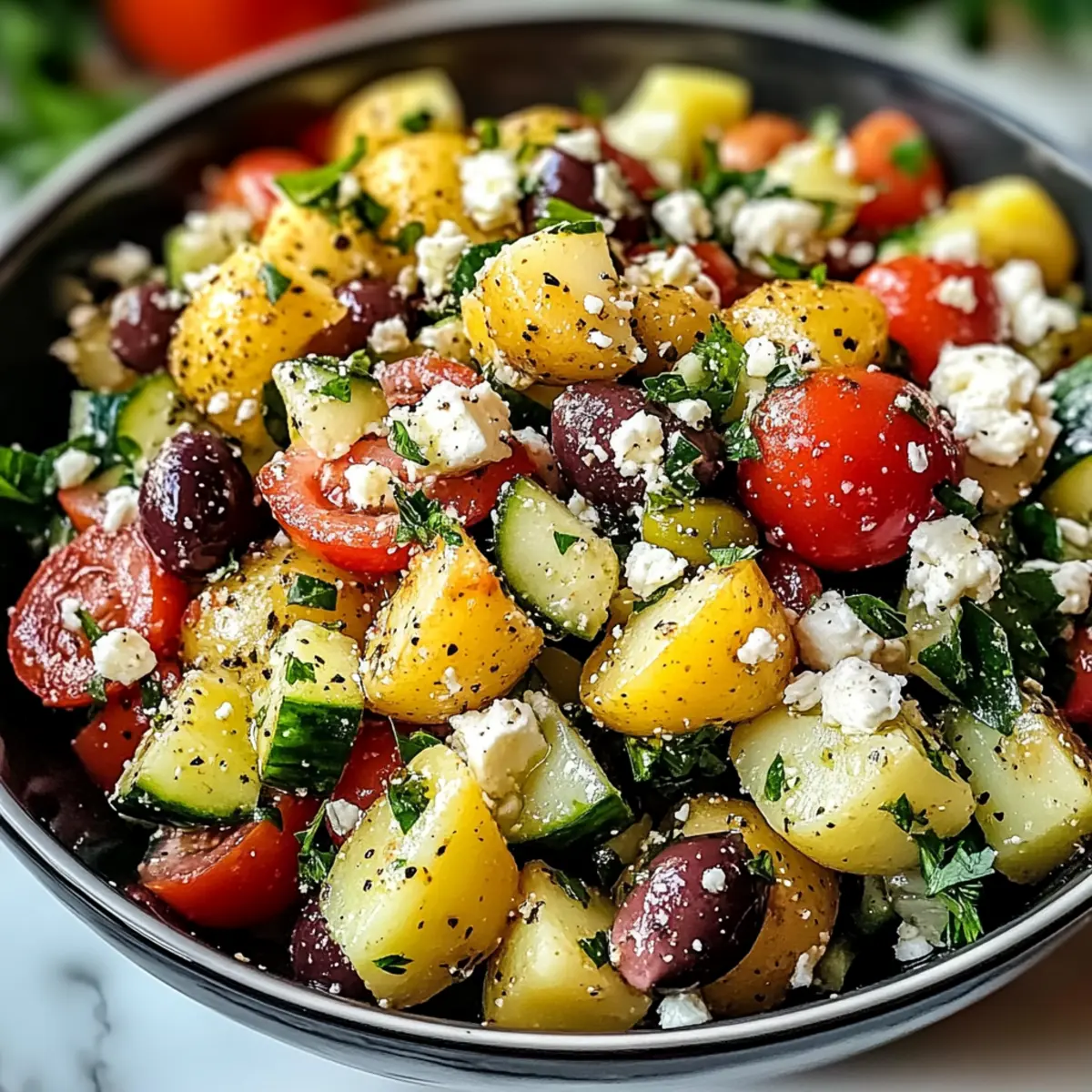 In einer großen Rührschüssel vermische die Kartoffelwürfel mit den frisch gehackten Kräutern, der fein gewürfelten roten Zwiebel, den geschnittenen Gurken, den gewürfelten Tomaten, den schwarzen Oliven und dem zerbröckelten Feta-Käse. Achte darauf, alle Zutaten gleichmäßig zu verteilen, um ein harmonisches Geschmacksbild zu erzielen.