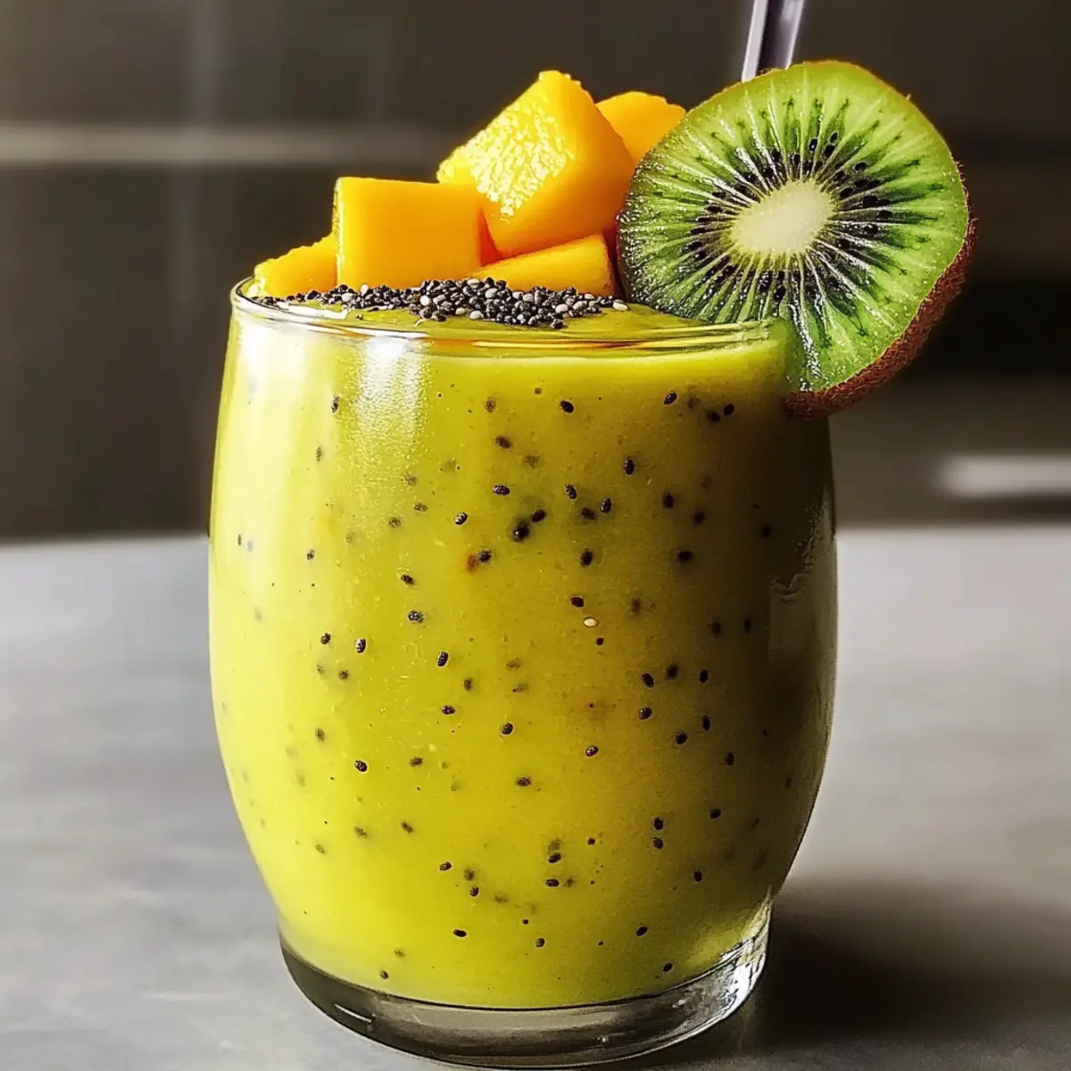 Genieße die harmonischen Aromen des Mango-Kiwi-Smoothies als Teil eines vollwertigen, tropischen Genusses, der für alle Sinne anregend ist.