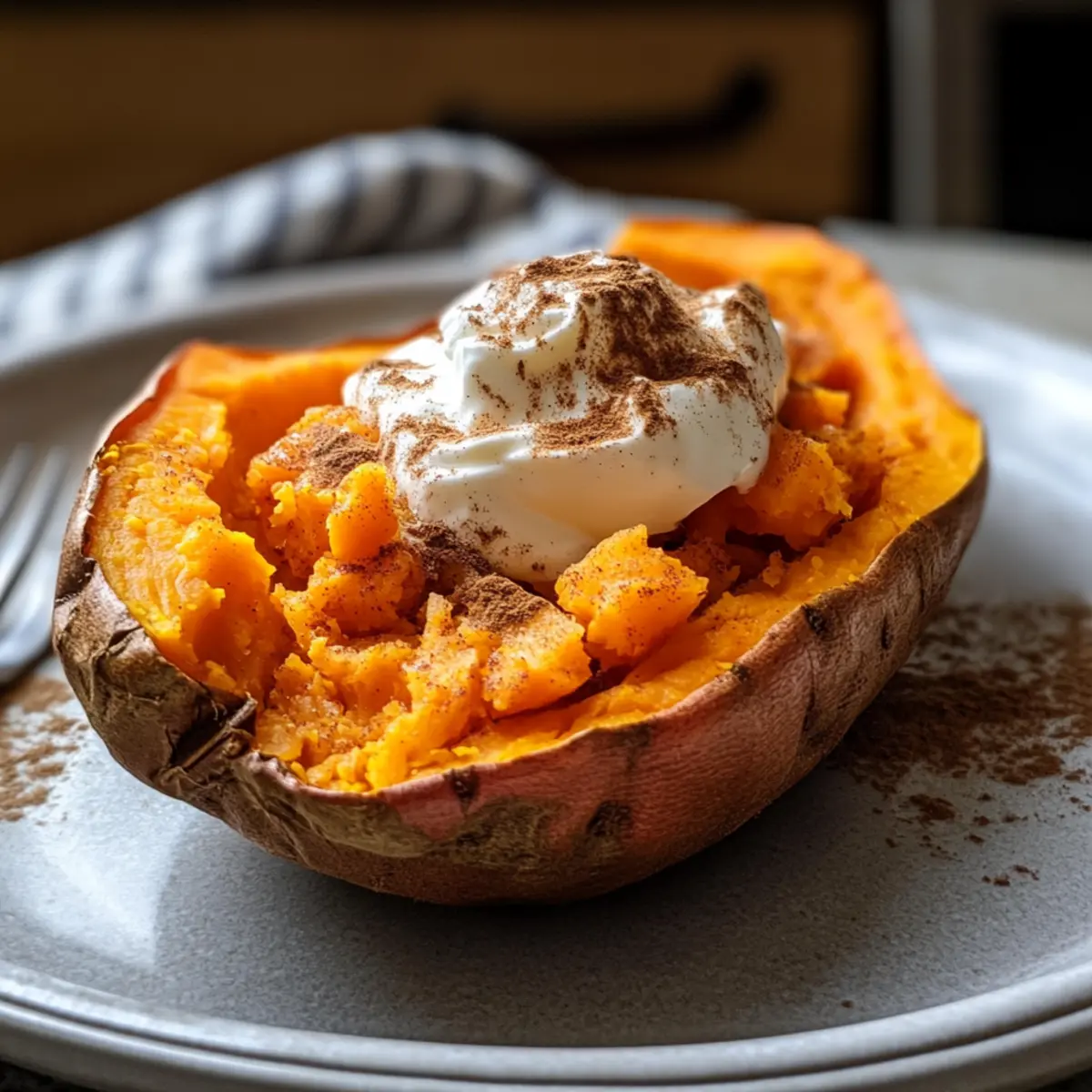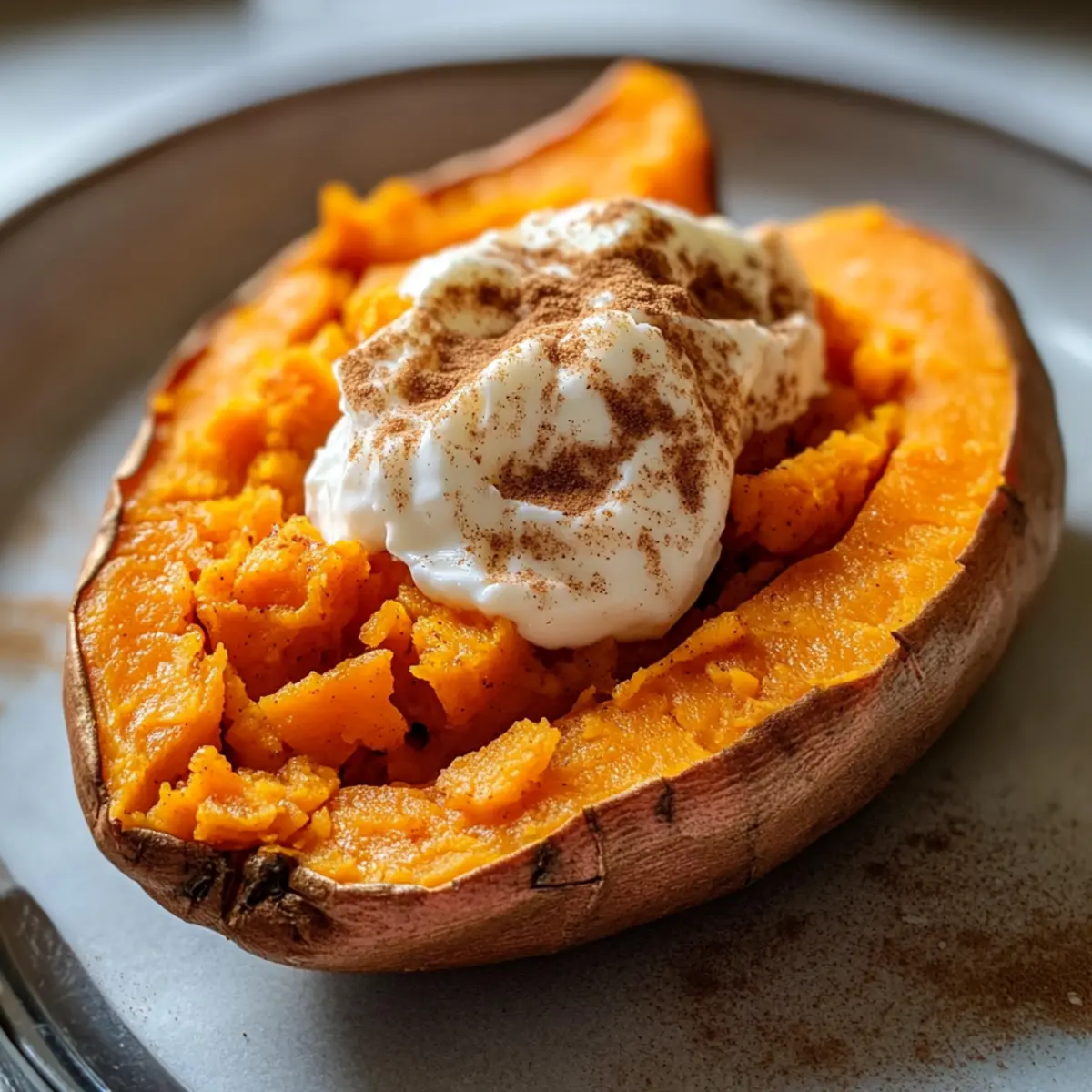 Cremiger Joghurt: Eine großzügige Portion griechischer Joghurt sorgt für einen erfrischenden Kontrast und ergänzt die natürliche Süße der Süßkartoffel herrlich.