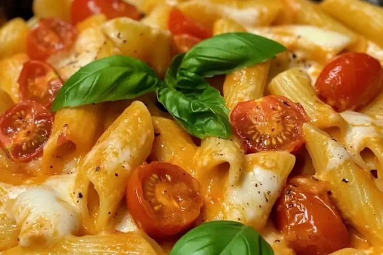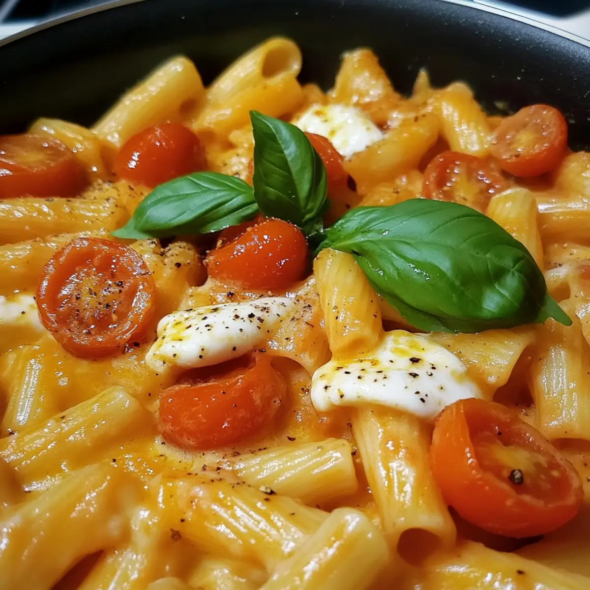 Wenn die Pasta fast fertig ist, probiert sie, um die Garstufe zu überprüfen. Fügt nun die halbierten Kirschtomaten, die vorbereiteten Mozzarella-Stücke und die frischen Basilikumblätter hinzu. Vermengt alles vorsichtig in der Sauce, sodass die Zutaten gleichmäßig verteilt sind, und lasst es für weitere 2-3 Minuten ruhen, damit der Mozzarella schmilzt.