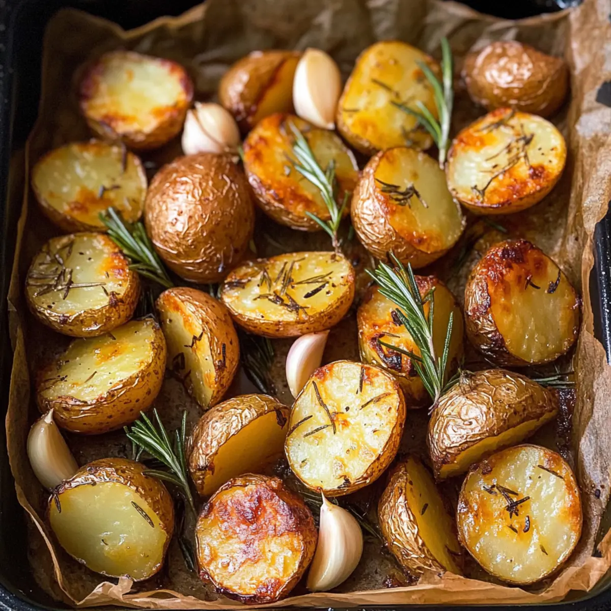- Füge die ungeschälten Knoblauchzehen und die frischen Rosmarinzweige zu den Kartoffeln hinzu.