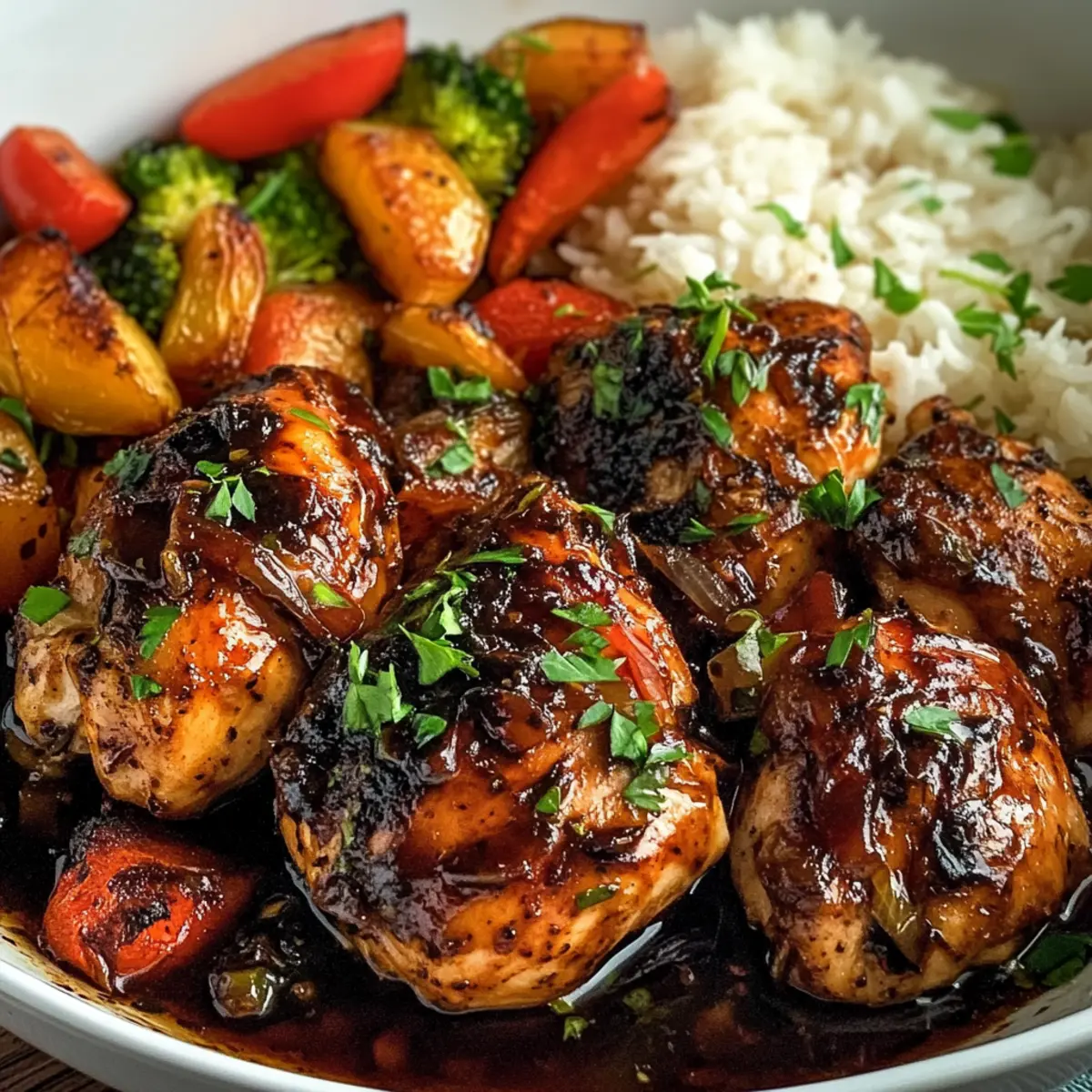 - Serviere das Schmortopf Balsamico Hühnchen auf einem Bett aus Pasta, Reis oder neben cremigen Kartoffeln.