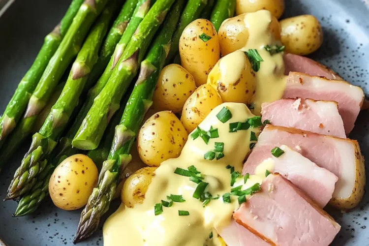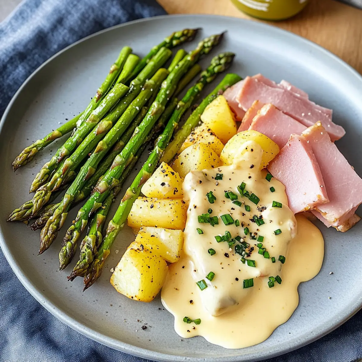 - Nimm einen Teller, schichte die gekochten Kartoffeln, Scheiben Schinken und den dampfenden Spargel darauf. Träufle die Hollandaise darüber.