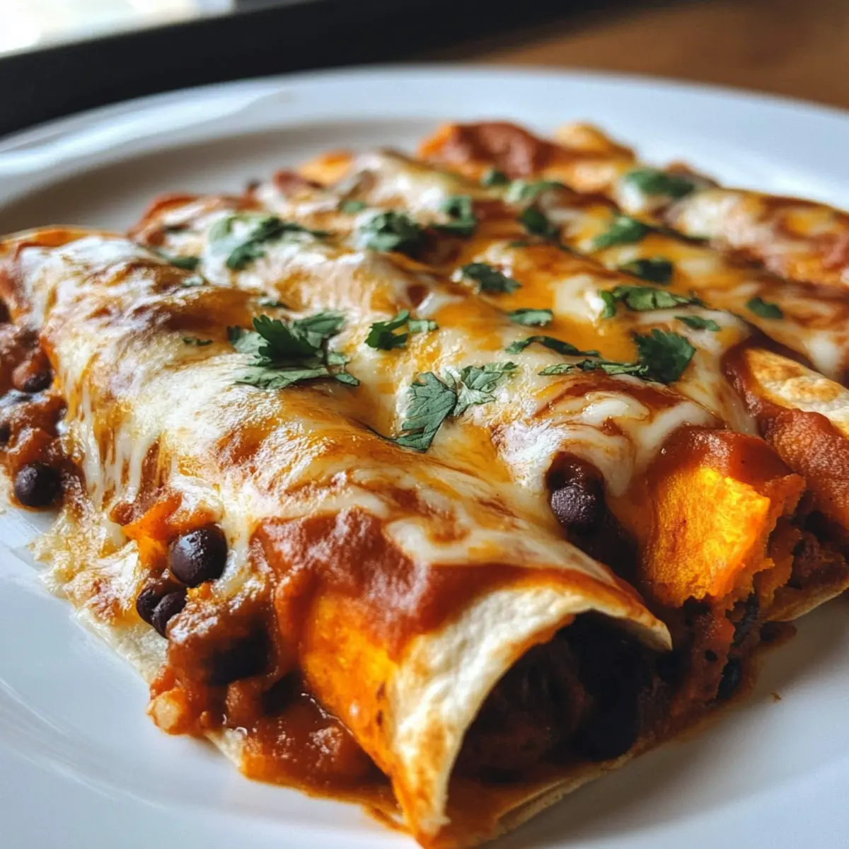 Backe die Süßkartoffel- und schwarze Bohnen-Enchiladas für 15-20 Minuten im Ofen, bis der Käse geschmolzen und leicht goldbraun ist. Achte darauf, dass die Enchiladas sämig und voller Geschmack sind, bevor du sie servierst.