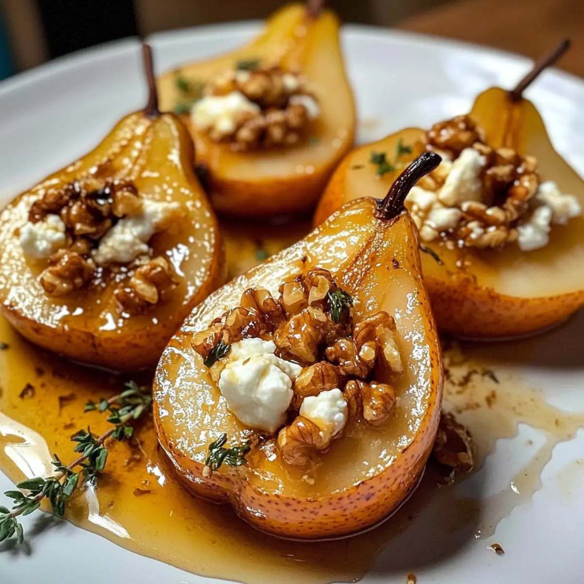 - Karamellisierte Walnüsse gleichmäßig über die Birnen streuen und mit frischem Thymian garnieren.